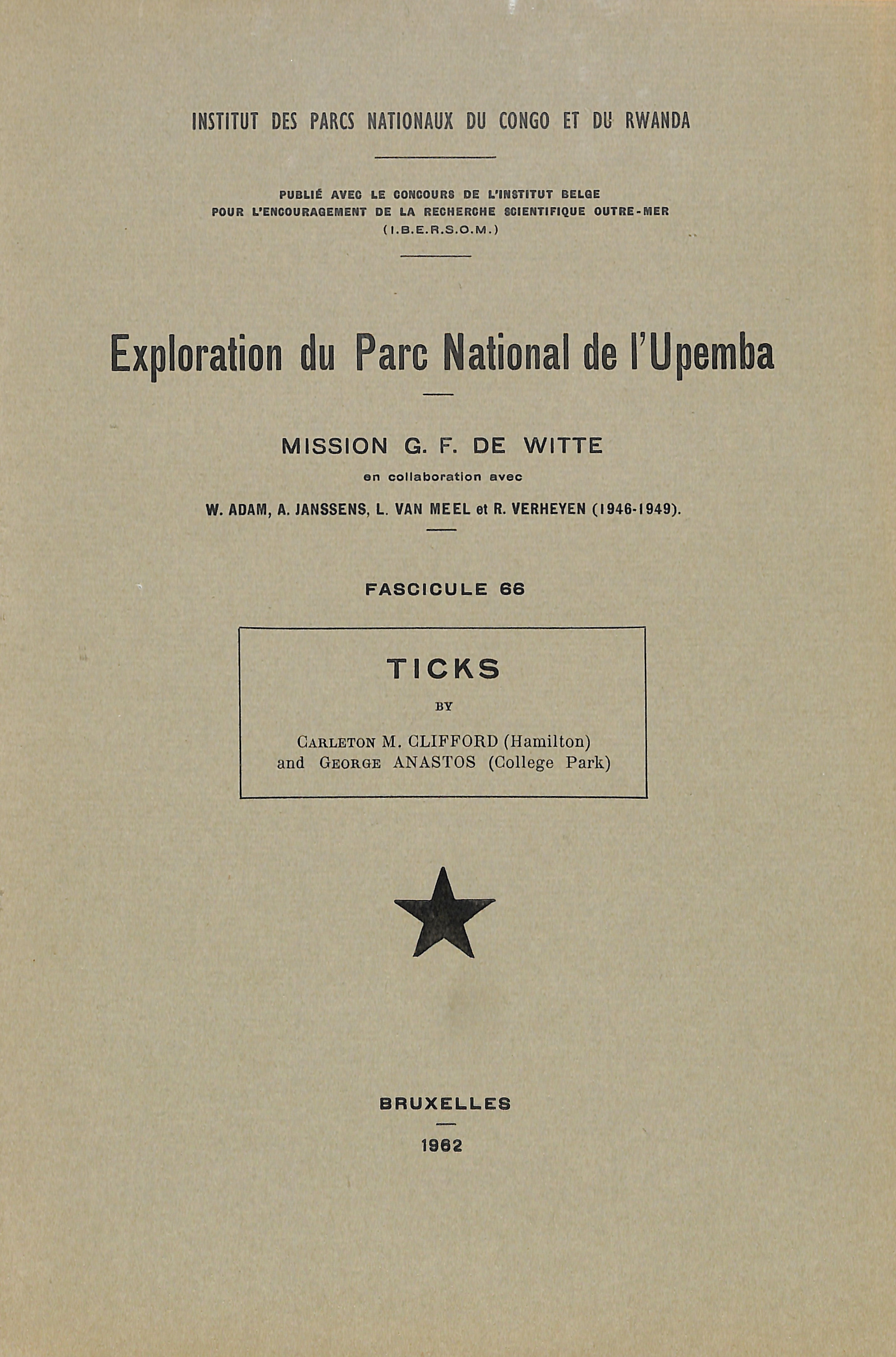 Clifford, C., & Anastos, G. (1967). Ticks. Institut Des Parcs Nationaux Du Congo Belge - Instituut Der Nationale Parken van Belgisch Congo - Exploration Du Parc National de l’Upemba - Exploratie van Het Nationaal Upemba Park - Mission/Zending G.F. de Witte., (66), 3–45.